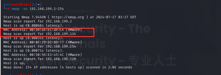 先用nmap把内网的靶机扫出来nmap -sn 192.168.199.1-254