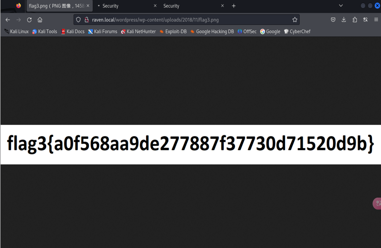 浏览器访问http://raven.local/wordpress/wp-content/uploads/2018/11/flag3.png 查看flag3