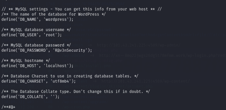 cd /var/www/html/wordpress 跟进带wp目录下,cat wp-config.php 查看wp的配置文件,拿到数据库的数据库名和密码