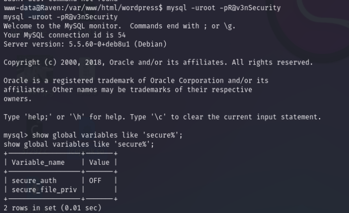 mysql -uroot -pR@v3nSecurity 连接数据库