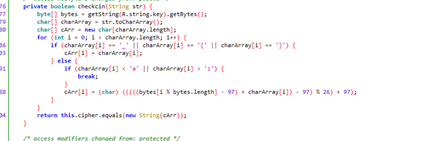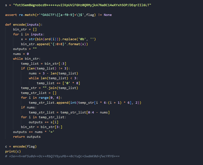 str = 'f`vg\u007fvkXknxfznQv|gz|\u007f}c|G~bh{{x|\u007fVVFGX'cipher = ''for i in range(0,len(str)): cipher += chr(ord(str[i:i+1]) ^ i)key = ['a', 'p', 't', 'x', 'c', 'o', 'n', 'y']flag = ''for i in range(0,len(cipher)): if ((cipher[i] != '_') and (cipher[i] != '{') and (cipher[i] != '}')): if (cipher[i] < key[i % len(key)]): flag += chr((ord(cipher[i]) - ord(key[i % len(key)]) + 26) % 26 + 97) else: flag += chr((ord(cipher[i]) - ord(key[i % len(key)])) % 26 + 97) else: flag += cipher[i]print(flag)flag{ez_crypto_algorithm_reverse_haha}